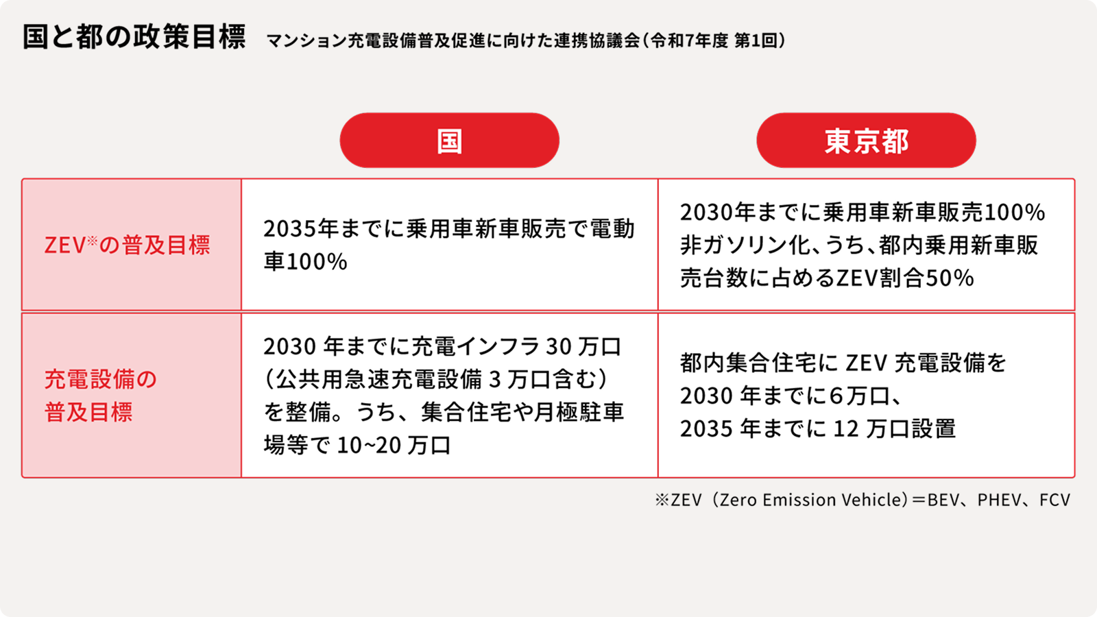 東京都では新築マンションへのEV充電設備設置が義務化され、全国的にもマンションでの導入が進んでいます。今後はEVの普及にあわせて、EV充電に対応したマンションがますます増えていく見込みです。